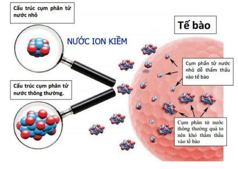 Phân tử nước siêu nhỏ: Kích thước cụm phân tử nước điện giải chỉ bằng 1/5 so với cụm phân tử nước thông thường. Cấu tạo đặc biệt này giúp cho nước điện giải thẩm thấu và vận chuyển các chất dinh dưỡng nhanh hơn, đồng thời giúp tế bào tẩy rửa và thanh lọc các chất cặn bã có hại ra ngoài.